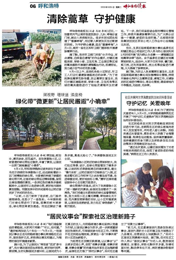 据了解,为防止入秋前蒿草反复生长,玉泉区昭君路街道办事处将加强精细化管理,持续开展绿化养护以及蒿草巡查、清理工作,对清除后的区域进行精细化、常态化管控,确保绿地内干净整洁,无枯枝、无杂草。